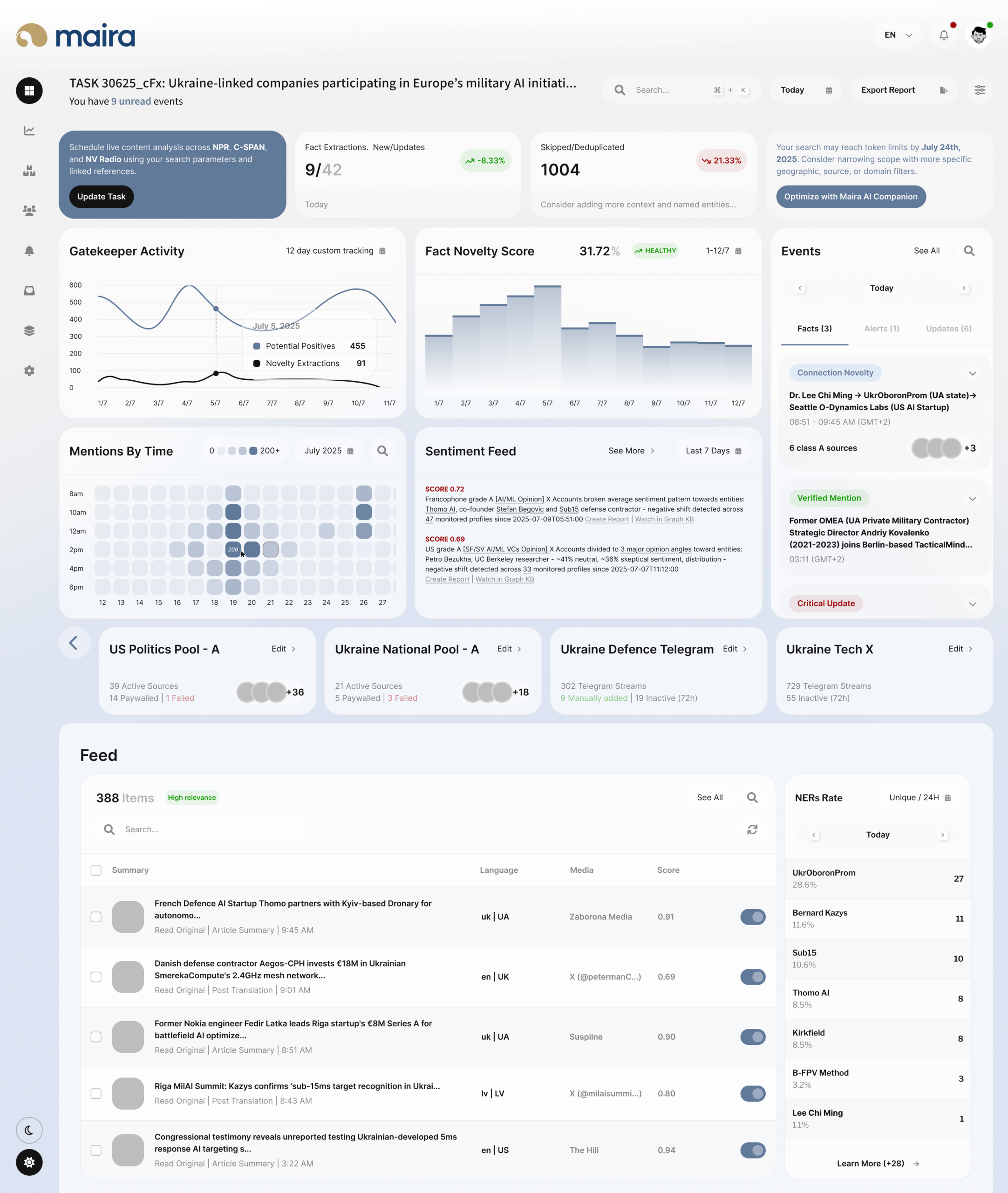 Prompt your research & monitoring tasks just like you’d talk to GPT. Maira identifies contextually relevant news and social buzz, helps pinpoint what’s truly important (or being overlooked), and delivers first insights within minutes.